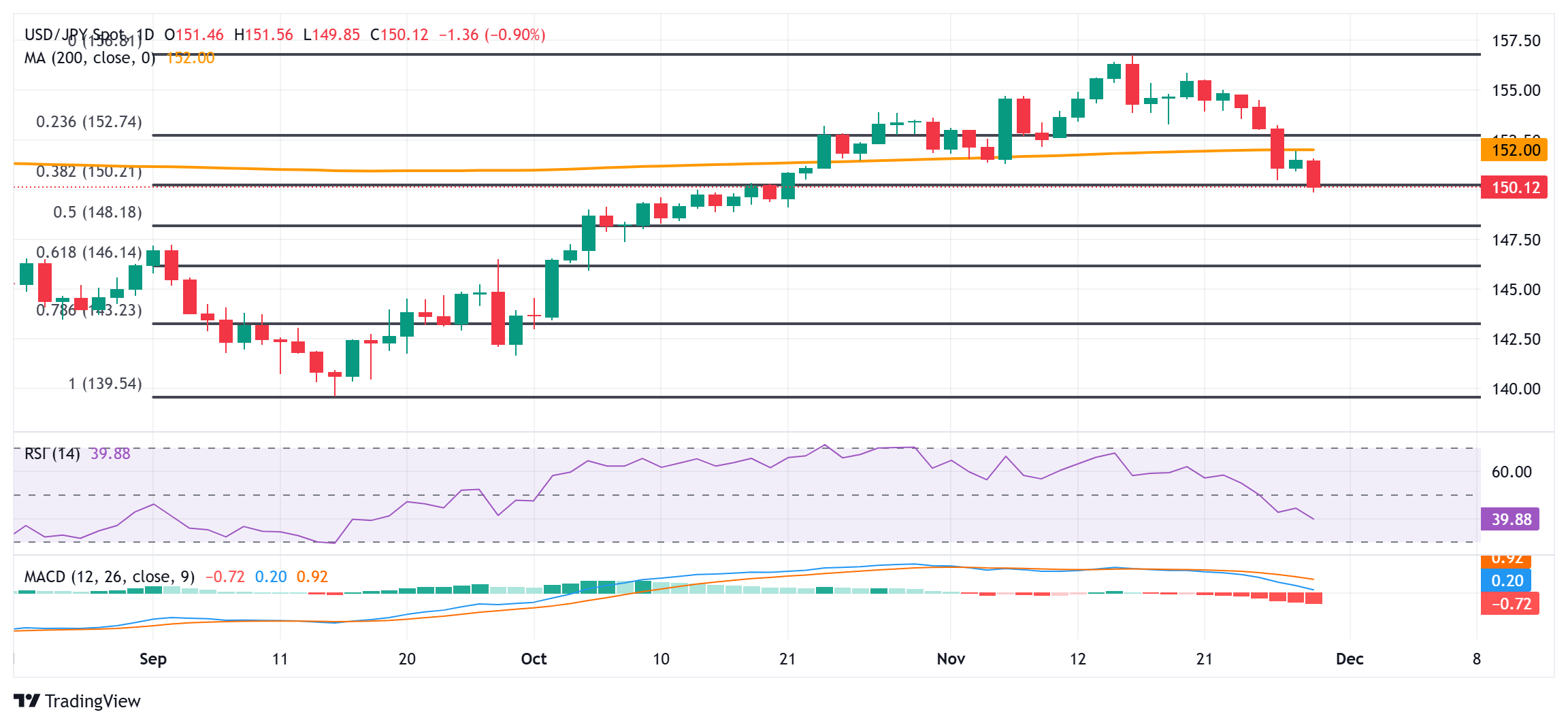 除此之外,Scott Bessent被提名为美国财政部长,以及美联储(Fed)将在12月再次降息的预期引发的美国国债收益率最近的下降,有利于收益率较低的日元。与此同时,美元触及两周低点,自10月21日以来首次将美元/日元汇率拖入150.00心理关口以下。