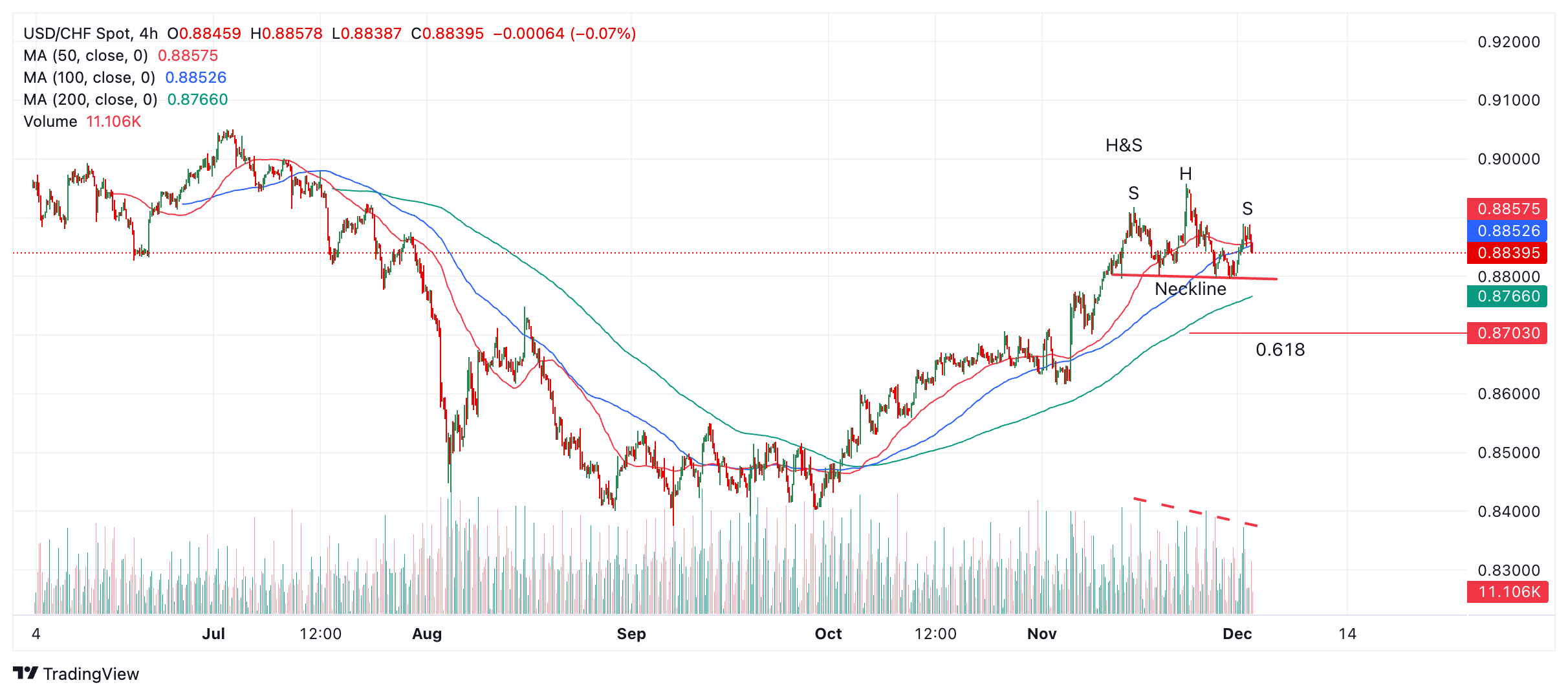 美元/瑞士法郎可能在4小时图上形成了看跌的头肩(H&S)反转模式,如果有效,则表明该货币对可能会下跌。