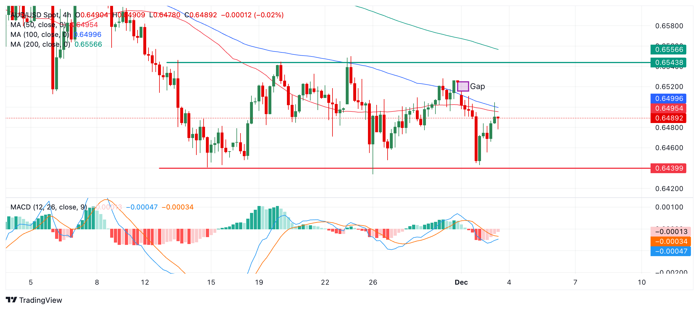 澳元/美元在0.6540(绿线)左右的上限和0.6440(红线)左右的下限范围内交易。该货币对可能处于短期横盘走势。