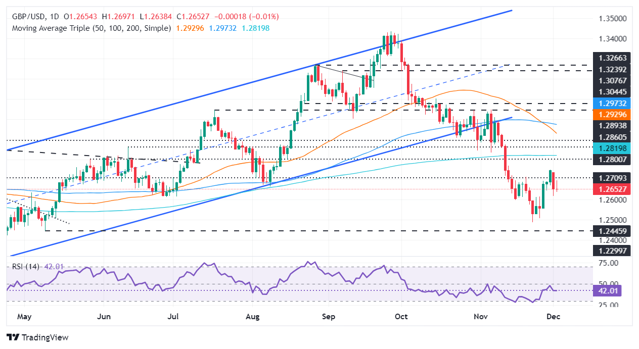 尽管英镑/美元从11月22日触及的六个月低点1.2486有所回升,但仍有下行趋势。尽管该货币对在11月29日创下1.2749的新高,但在1.2700以上未能被接受。