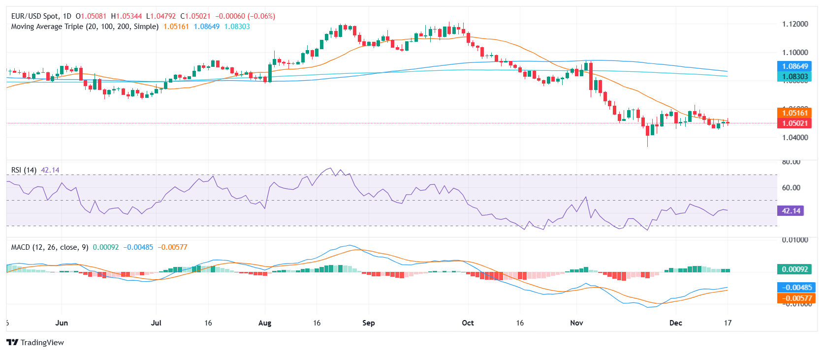 欧元/美元价格分析:该货币对在1.0505附近徘徊,在20天SMA以下挣扎