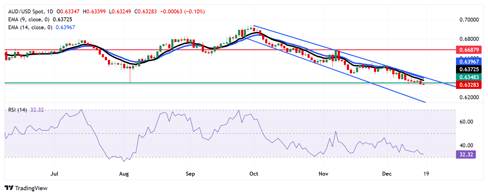 周三,澳元/美元在0.6330附近交易。对日线图的分析表明,由于该货币对被限制在下行通道模式内,因此普遍存在看跌倾向。此外,14天相对强弱指数(RSI)略高于30点,表明持续看跌势头活跃。然而,跌破30点将表明超卖情况和向上调整的可能性。