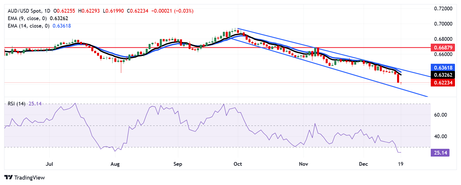 周四,澳元/美元汇率接近0.6220。对日线图的分析表明,随着该货币对在下行通道模式中向下移动,普遍存在看跌倾向。然而,14天相对强弱指数(RSI)已跌破30点,表明存在超卖情况,并有可能很快向上调整。