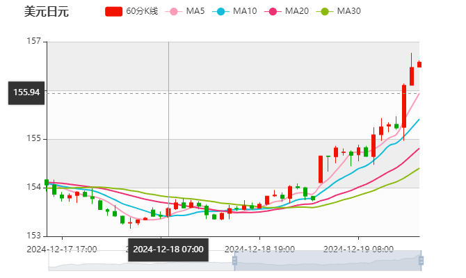 周四(12月19日)亚盘早盘,美元兑日元上涨,目前交投于155附近,截止北京时间11:32分,美元兑日元报价155.27,上涨0.35%,上一交易日美元兑日元收盘为154.73。日本央行今日维持货币政策不变,暗示鉴于目前的不确定性和通胀超调的可能性不大,目前没有加息的紧迫性。