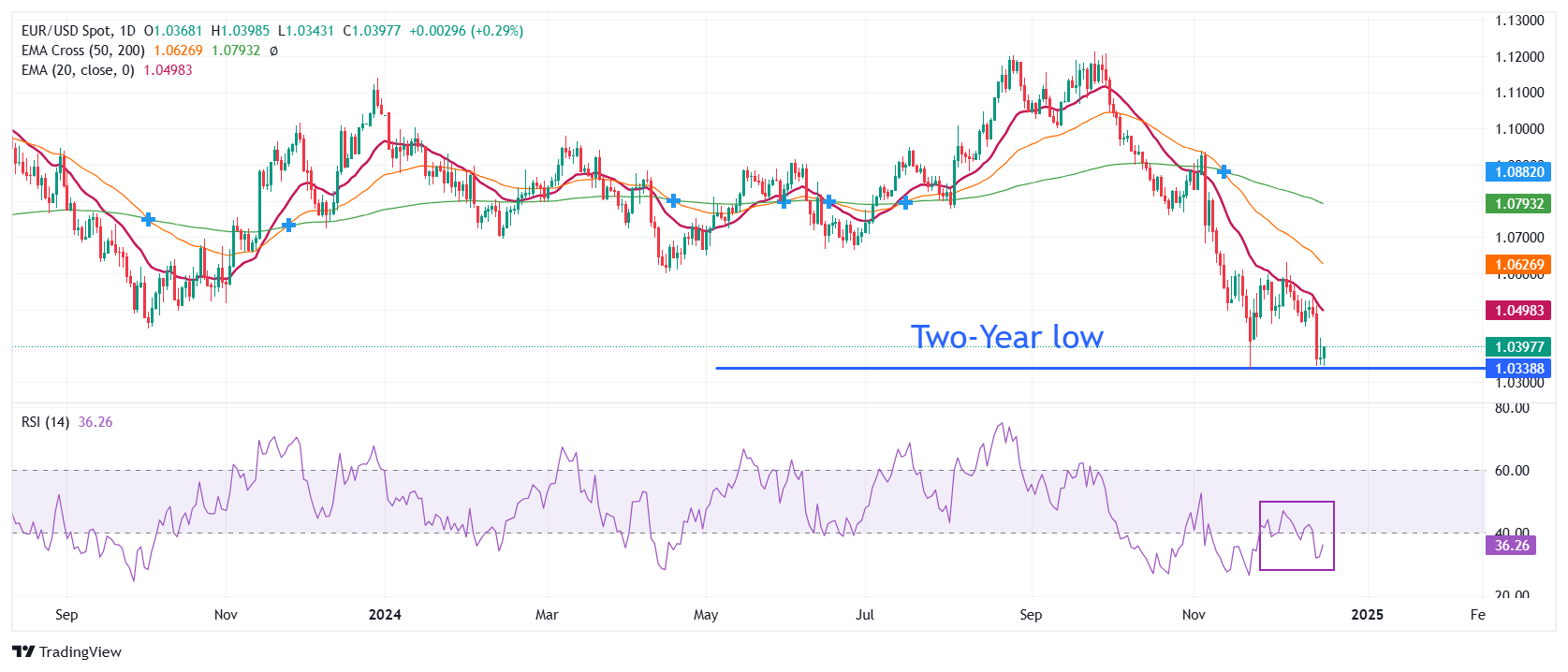 欧元/美元在周五的欧洲交易时段保持1.0340的关键支撑位。然而,主要货币对的前景仍然强烈看跌,因为所有短期到长期的指数移动平均线(EMA)都在下跌。