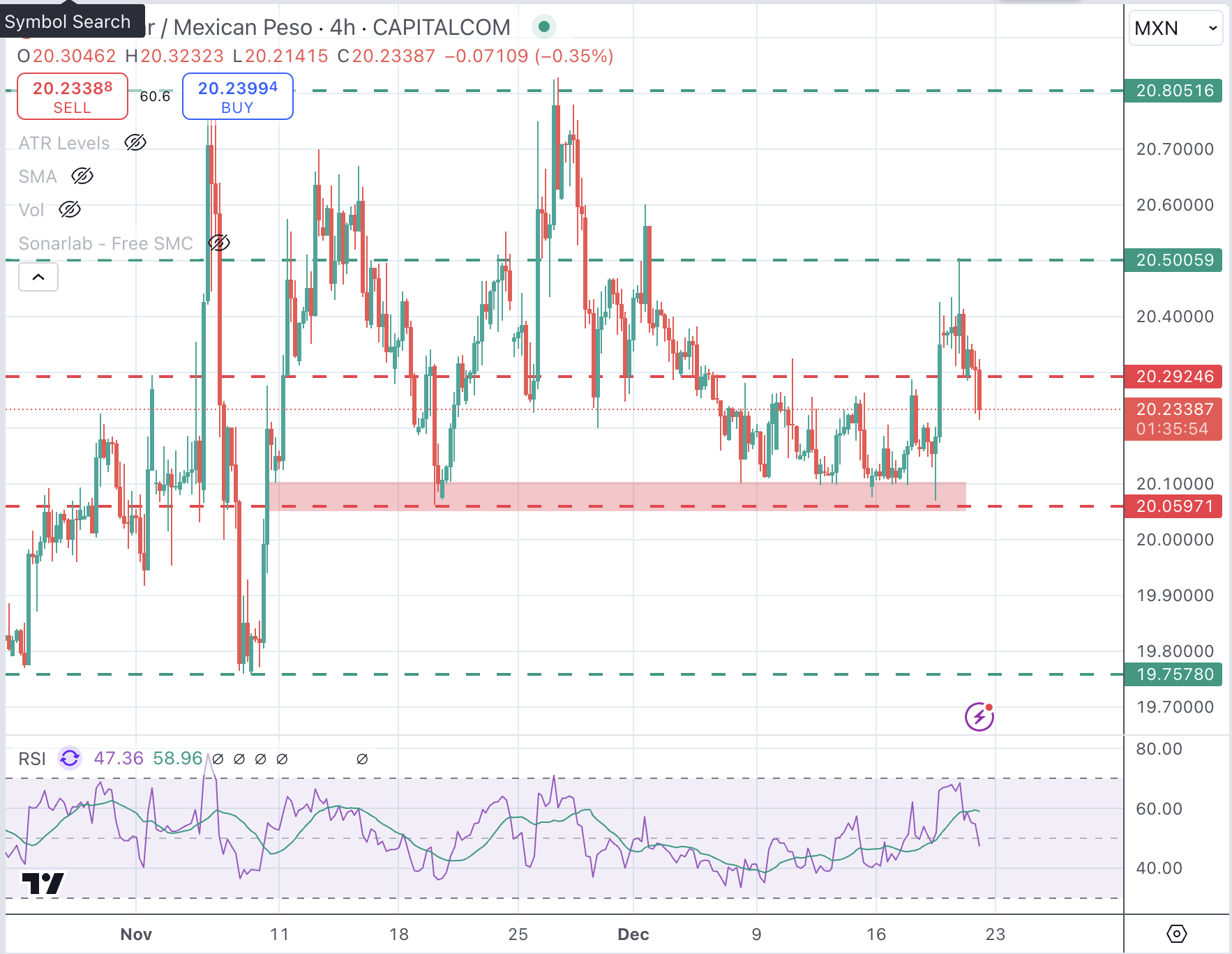 美元/墨西哥比索失去涨幅,再次接近关键的20.00支撑区。