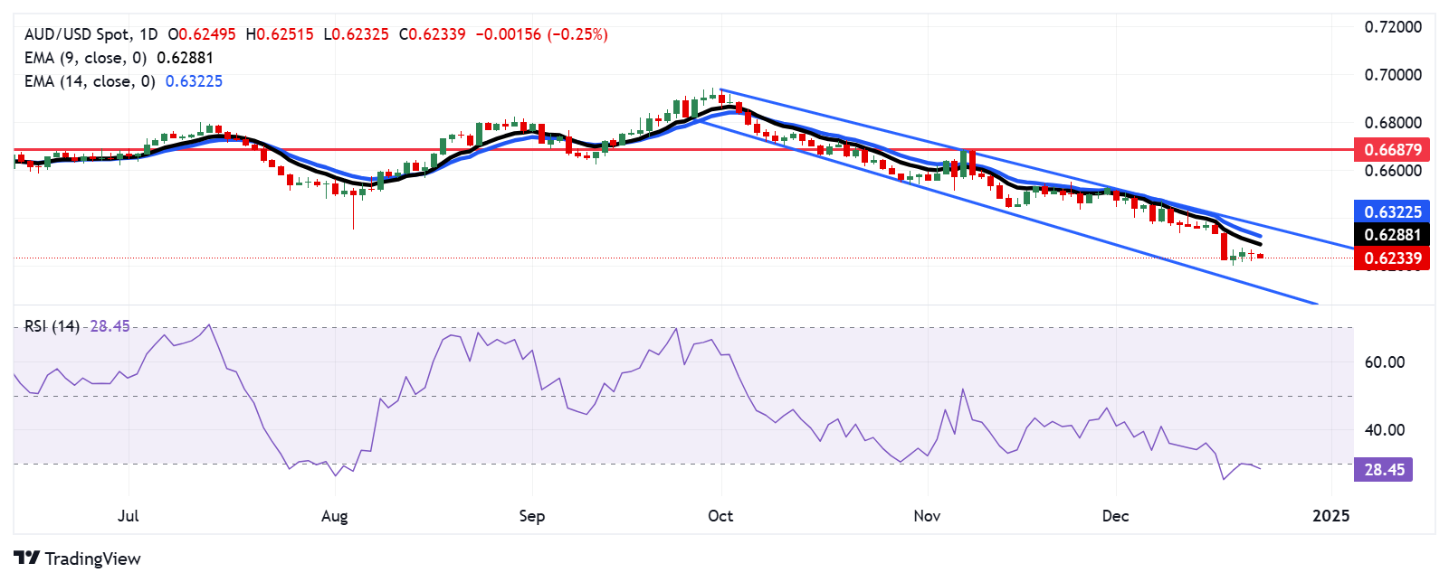 周二,澳元/美元在0.6230附近交易,日线图显示,由于该货币对仍处于下行通道模式,因此存在持续的看跌倾向。14天相对强弱指数(RSI)跌破30点,表明近期潜在的向上修正将消散。