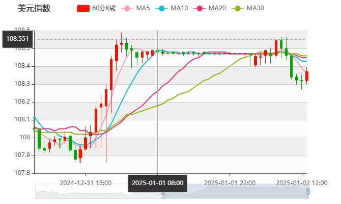 周四(1月2日)亚盘早盘,美元指数最新价报108.35,跌幅0.07%,开盘价为108.49。从美国方面来看,美元的强势表现主要受到美债收益率上升的支撑。