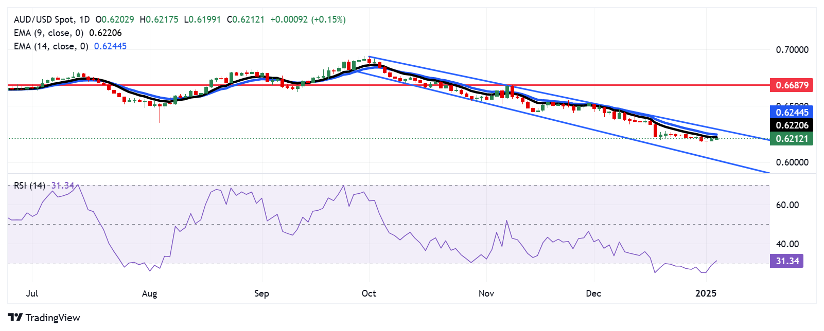 周四,澳元/美元在0.6210附近交易,保持看跌前景,因为它仍处于日线图的下降通道内。然而,14天相对强弱指数(RSI)已反弹至30点以上,表明尽管当前呈下降趋势,但短期内仍有可能出现向上调整。