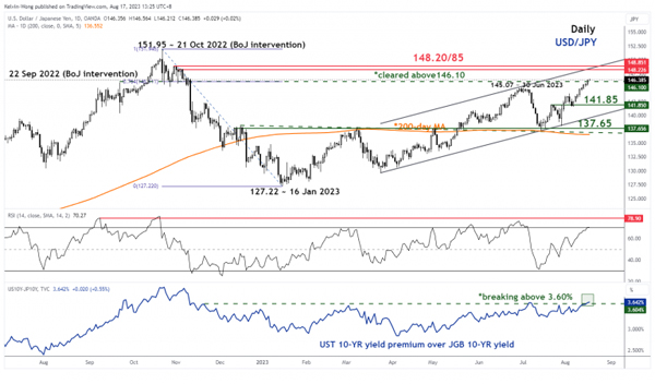 美元/日元持续上涨,并突破 145.50/146.10 阻力位,当时日本央行 (BoJ) 于去年 9 月 22 日进行外汇干预,以抵消日元在从 2021 年 1 月低点到 10 月的主要上行阶段中出现的疲软。 2022 年高点,这是自 1998 年以来首次市场干预。昨天,即 8 月 16 日收盘走高,收于 146.36 点,接近美国时段盘中高点 146.41 点。