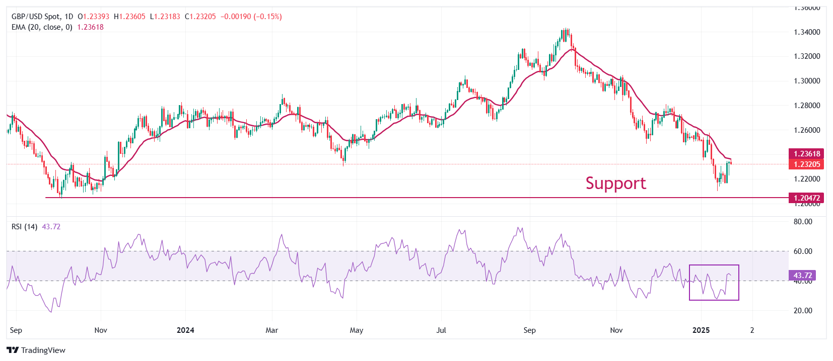 英镑兑美元努力突破20天指数移动平均线(EMA),EMA的交易价格约为1.2360。英镑/美元在1月13日创下一年多来新低1.2100后反弹。