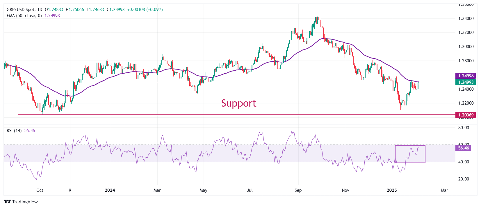 周三,英镑兑美元汇率连续第三个交易日上涨。英镑/美元上涨至1.2500附近的50天指数移动平均线(EMA)。