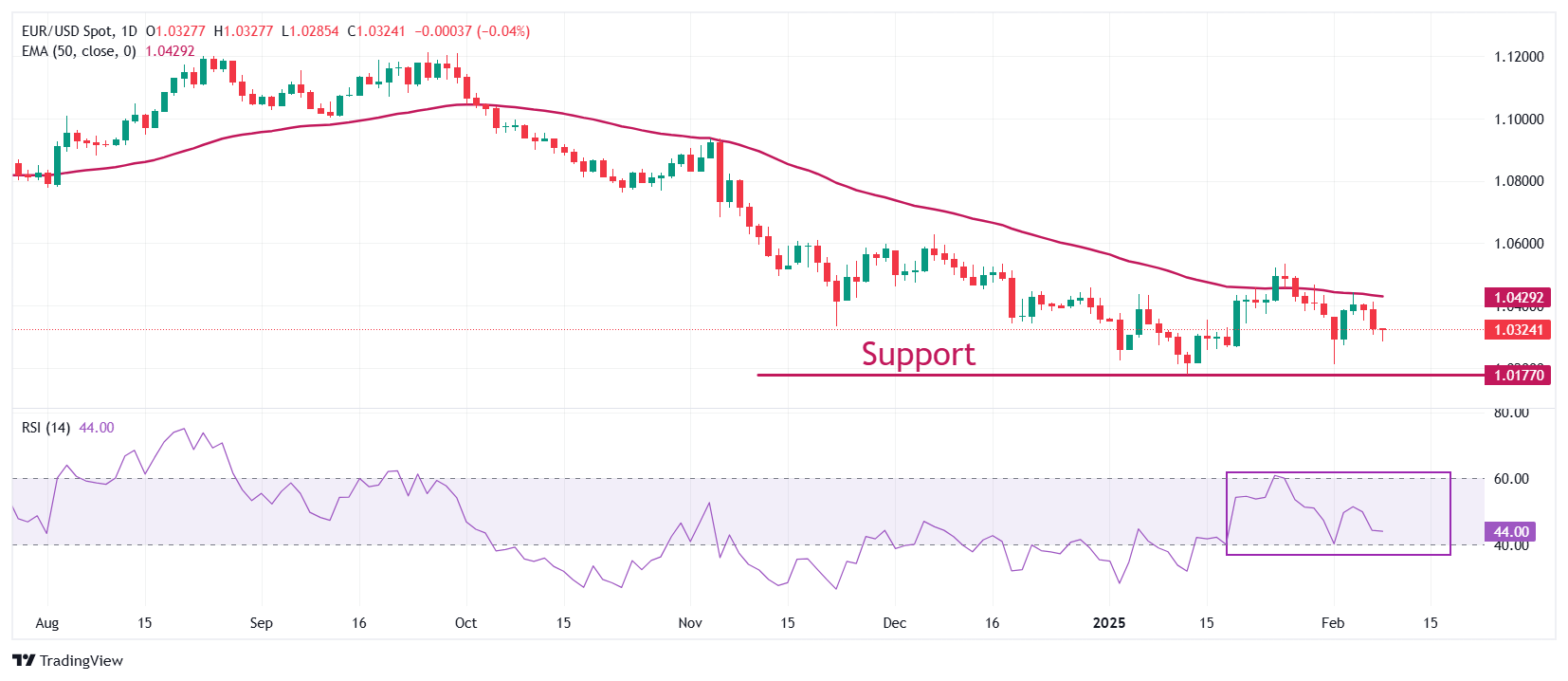 周一欧洲交易时间,欧元/美元升至1.0330附近。然而,主要货币对的前景仍然不确定,因为它继续面临上周以来在1.0436附近的50天指数移动平均线(EMA)附近的压力。