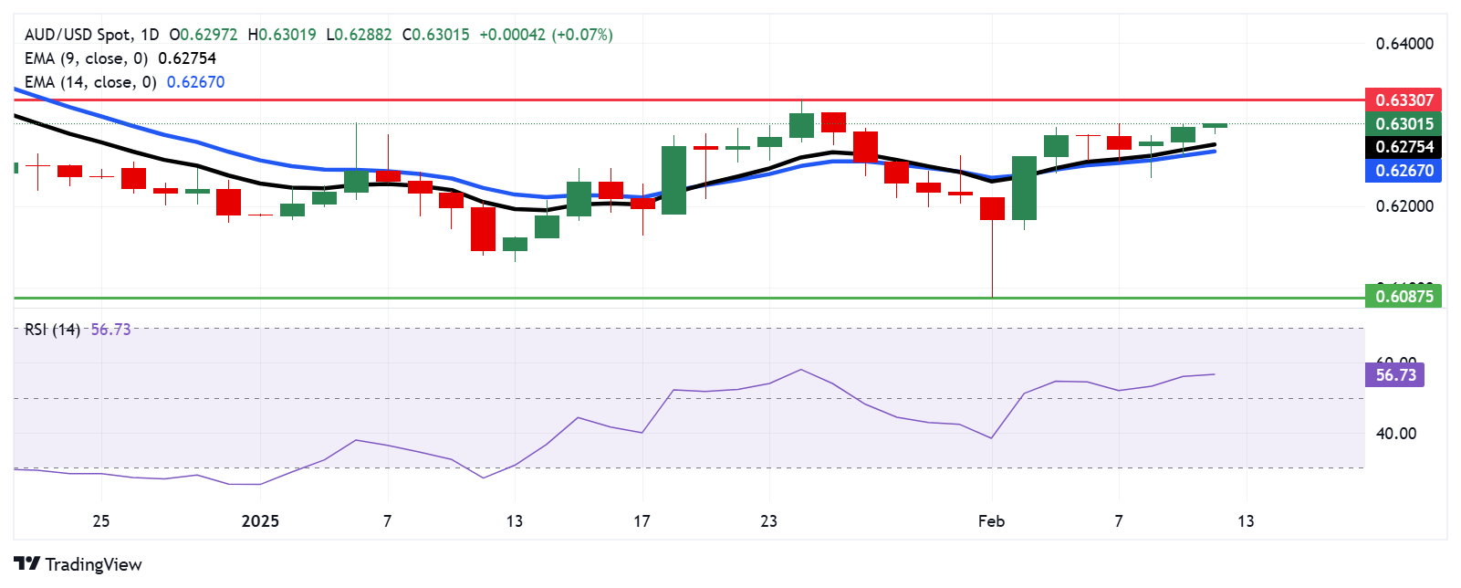 周三,澳元/美元对徘徊在0.6300附近,保持在日线图上9天和14天指数移动平均线(EMA)上方的位置。这表明短期价格势头更强。此外,14天相对强弱指数(RSI)保持在50点以上,强化了看涨倾向。