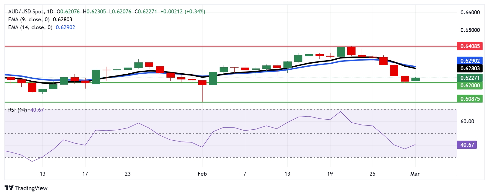 周一,澳元/美元汇率在0.6220左右。日线图分析表明,该货币对仍处于压力之下,交易低于9天和14天的指数移动平均线(EMA),表明短期势头减弱。此外,14天相对强弱指数(RSI)仍低于50,强化了看跌前景。