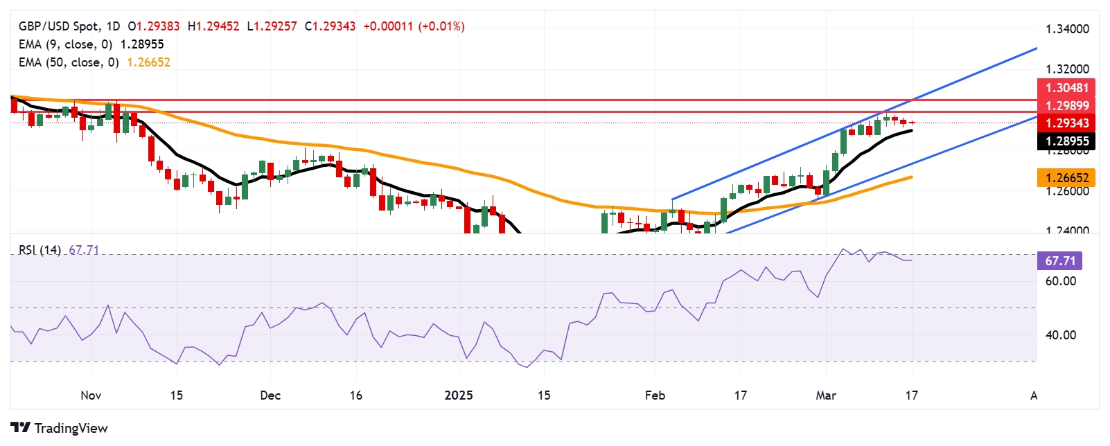 英镑/美元对连续第三个交易日延续跌势,周一亚洲时段交易在1.2940左右。对日线图的技术分析表明,该货币对持续看涨,在上升通道模式中向上移动。