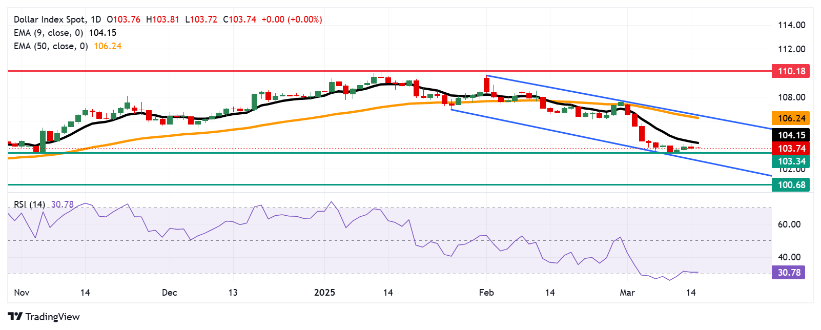 追踪美元对六种主要货币表现的美元指数(DXY)连续第二个交易日仍面临压力,在周一的欧洲交易时间徘徊在103.70左右。日线图的技术分析表明,由于指数在下降通道内呈下降趋势,因此前景持续看跌。