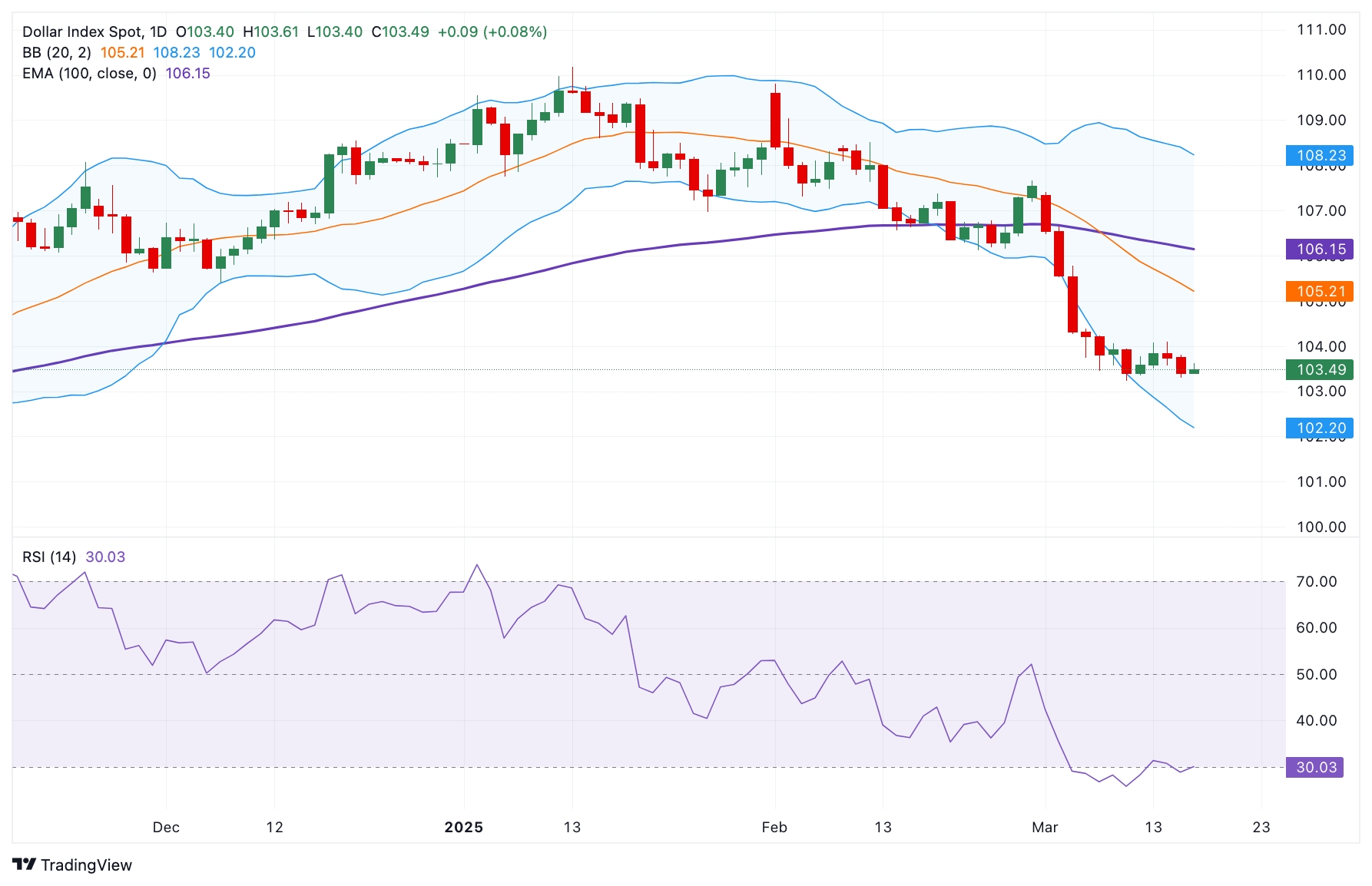 美元指数(DXY)是衡量美元(USD)对一篮子六种世界货币价值的指数,在周二欧洲早盘期间收复了一些失地,接近103.60。由于担心美国总统唐纳德·特朗普的关税政策可能引发更广泛的经济放缓,美元的潜在上行空间可能有限。