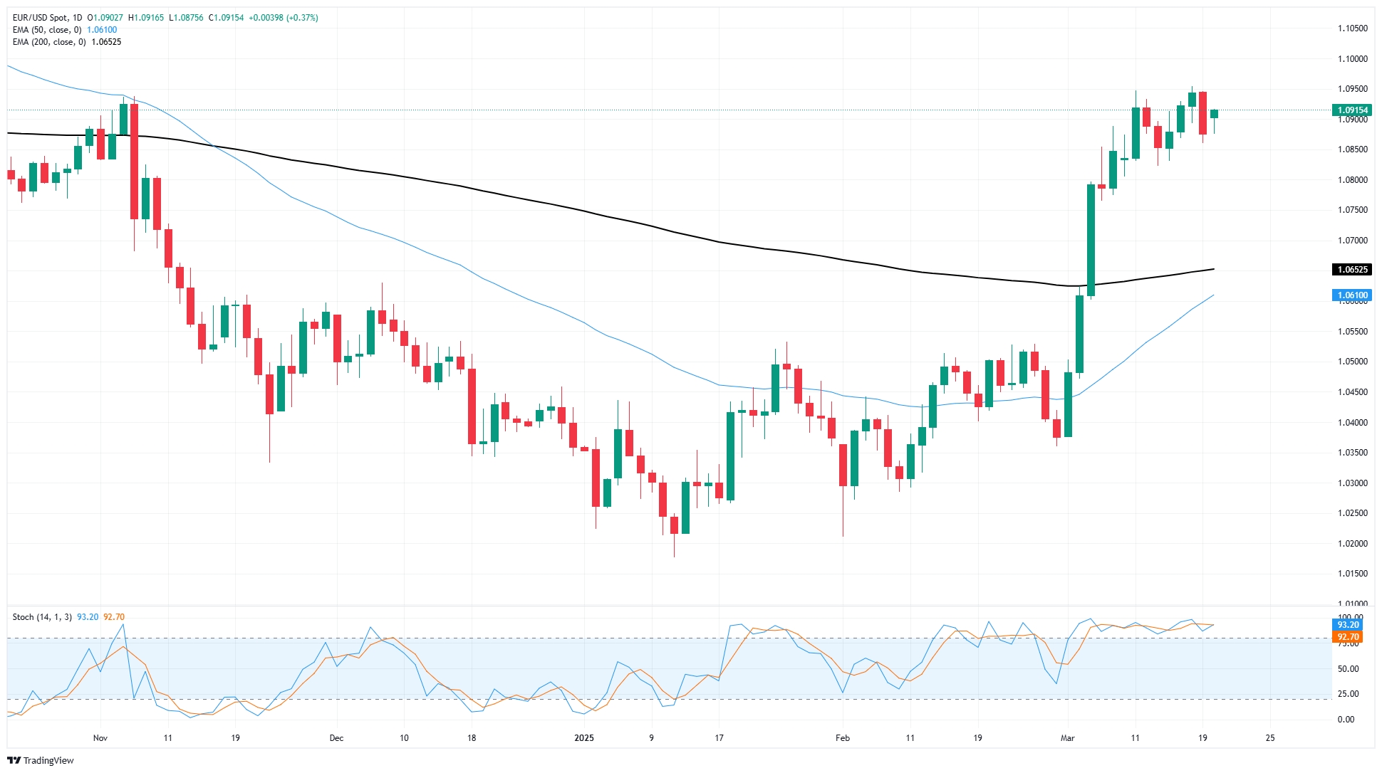 周三,欧元/美元继续上涨至1.0900点上方,受美联储(Fed)在中间市场开会并在另一次会议上保持利率稳定后绿背资金流普遍宽松的支撑。美联储主席杰罗姆·鲍威尔指出,特朗普政府在社交媒体上宣布贸易关税的不稳定政策严重阻碍了2025年的增长预测,后来又收回了这些关税。因此,联邦公开市场委员会(FOMC)将其2025年底的国内生产总值(GDP)预测修订为1.7%,与12月公布的2.1%相比大幅下降。