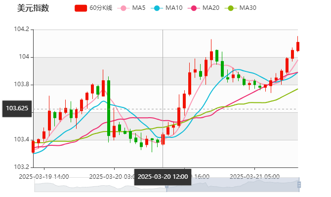 周五(3月21日)亚盘早盘,美元指数最新价报103.83,涨幅0.02%,开盘价为103.82。美国总统特朗普的贸易政策持续引发市场不安,投资者担心全球贸易紧张局势可能拖累经济增长,从而削弱美元吸引力。