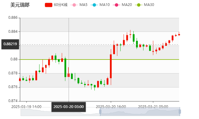 周五(3月21日)美元兑瑞郎汇率今日开盘报0.8816,昨日收盘于0.8818,截至发稿前美元/瑞郎报0.8827,涨幅0.10%,最高价0.8828,最低价0.8806。瑞士央行宣布降息25个基点至0.25%,该行行长指出全球经济不确定性加剧,这一政策旨在应对潜在的经济下行风险。