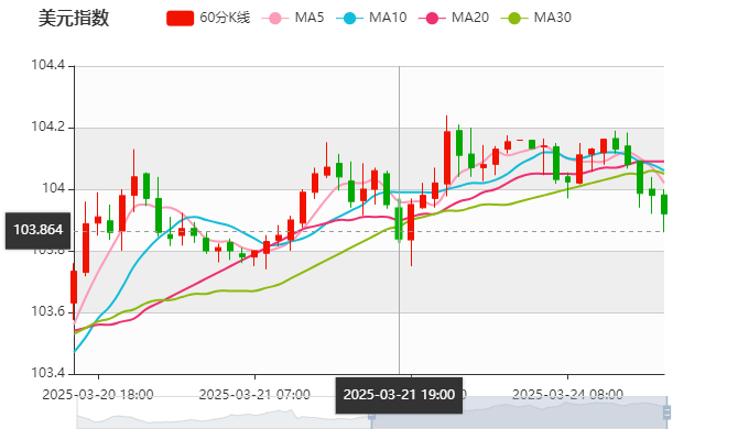 周一(3月24日)亚盘早盘,美元指数最新价报104.11,跌幅0.06%,开盘价为104.19。美联储上周三决定维持利率不变,并重申年内将实施两次0.25个百分点的降息,与三个月前预测一致。