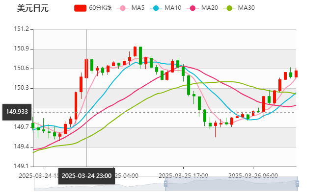 周三(3月26日)亚盘早盘,美元兑日元上涨,目前交投于150附近,截止北京时间10:30分,美元兑日元报价150.13,上涨0.17%,上一交易日美元兑日元收盘为149.87。根据电子交易系统(EBS)所提供的数据,在周二的交易时段中,美元/日元汇率在150.42至150.95这一区间内频繁波动。