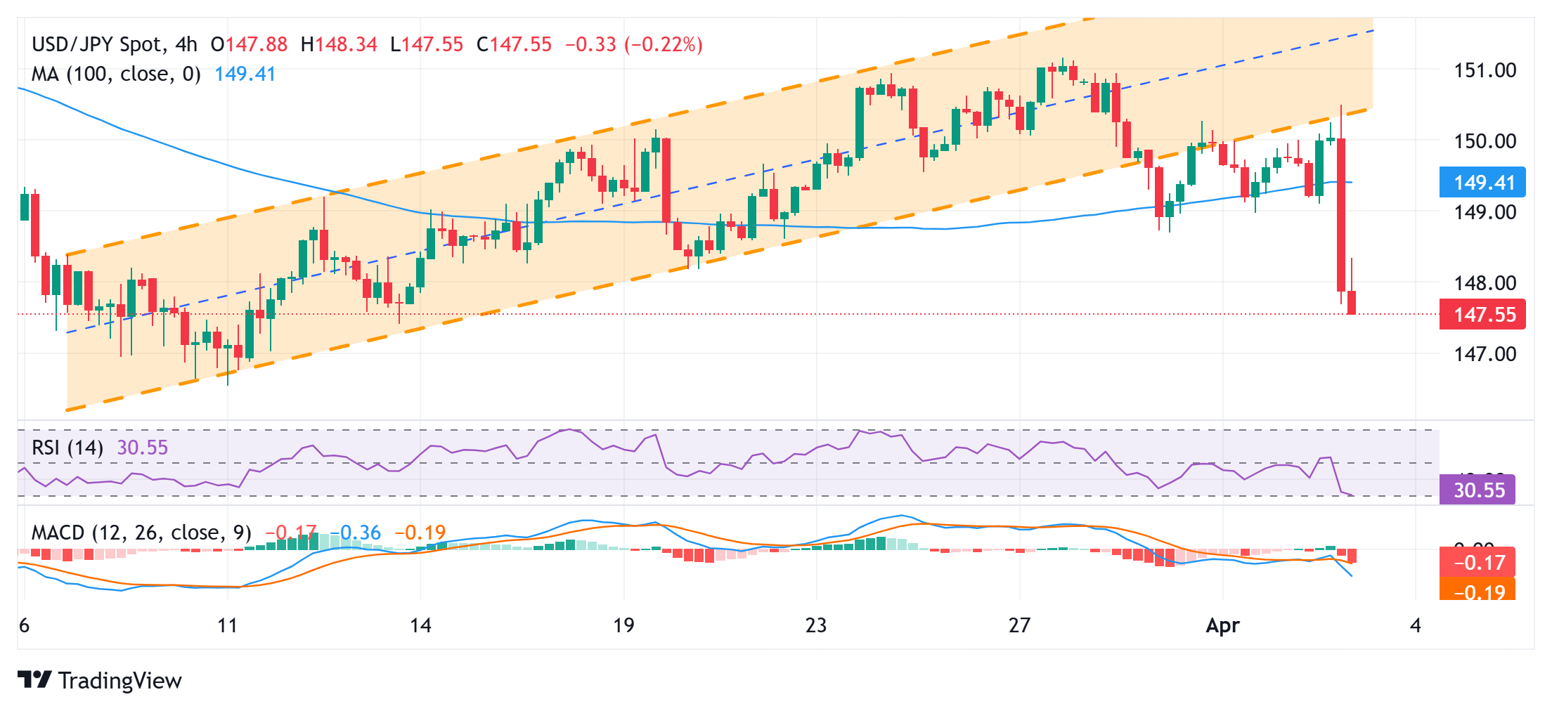日元(JPY)在周四的欧洲早盘时段继续维持其强劲的日内涨幅,同时美元(USD)普遍下跌,使得美元/日元(USD/JPY)在147.00水平以下保持沉重的卖压,创下近四周低点。投资者越来越担心美国总统唐纳德·特朗普的大规模互惠关税可能会重塑全球贸易体系,并对世界经济产生负面影响。这反过来对全球风险情绪产生了影响,并推动了对传统避险资产,包括日元的需求。