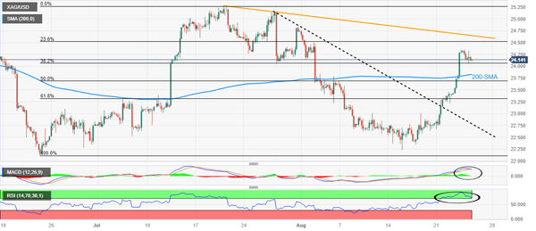 即便如此,23.6% 斐波那契回撤位和 7 月底以来的向下倾斜阻力线(分别接近 24.55 美元和 24.65 美元)将在白银/美元多头获得控制权之前对其构成挑战。