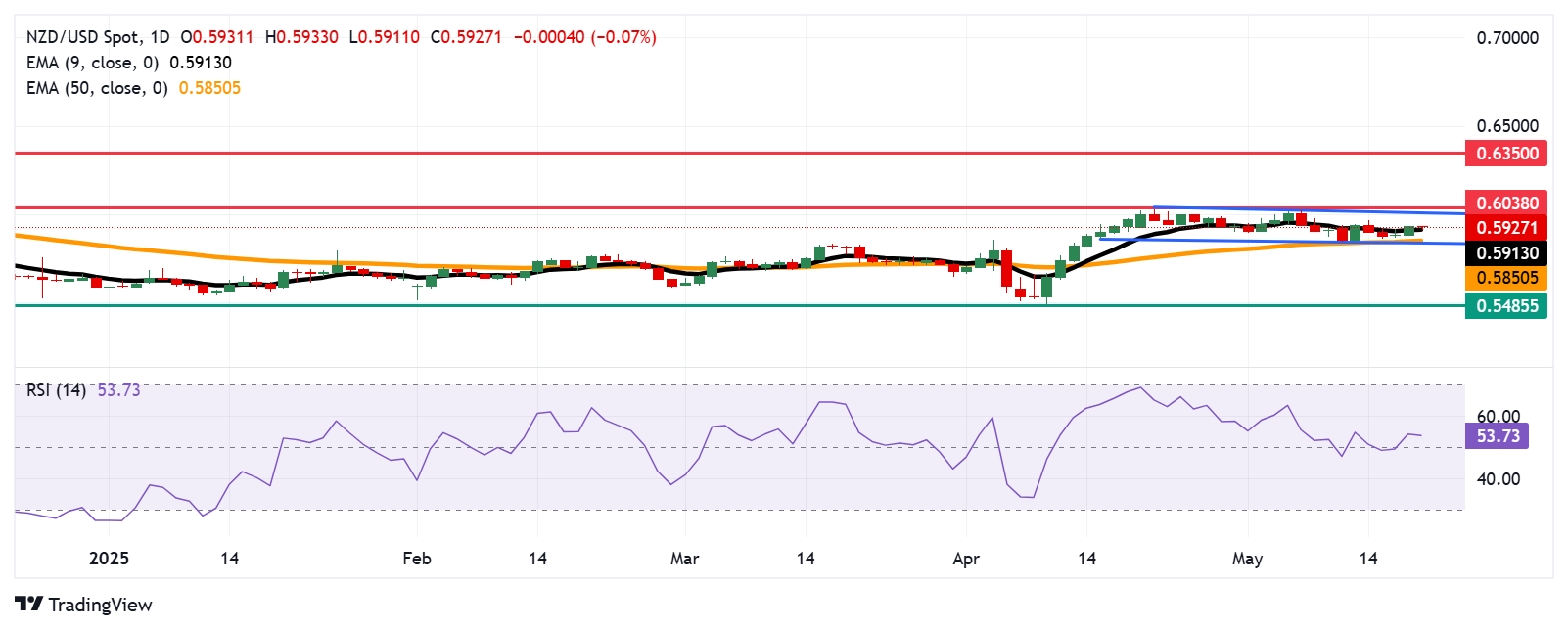 相对强弱指数(RSI)在14天内徘徊在50附近,表明有轻微的看涨倾向。同时,纽元/美元汇率在九日指数移动平均线(EMA)附近交易,显示短期中性趋势。