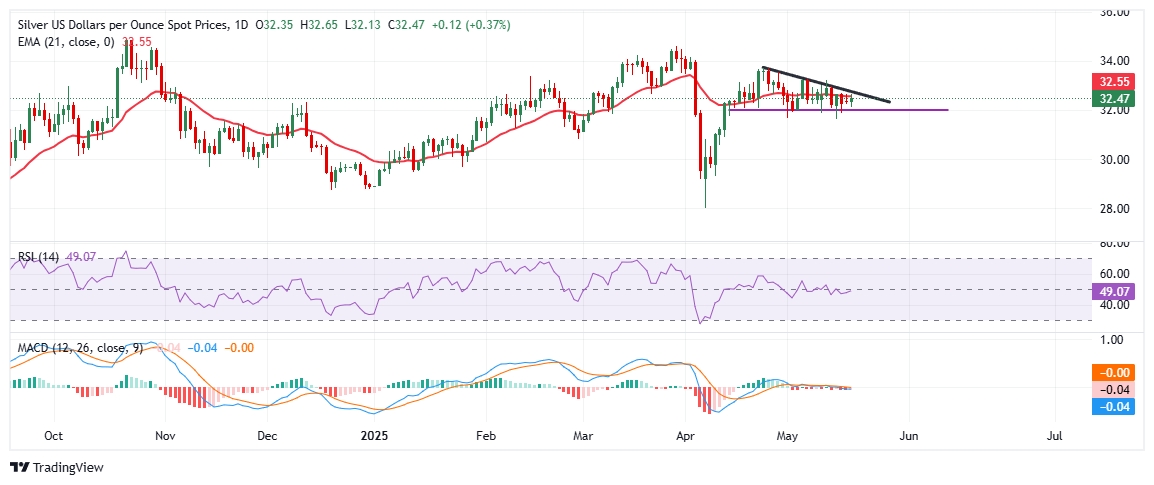 技术上,银价正在对称三角形形态内整理,价格在心理支撑位32.00美元附近的水平支撑和从四月高点延伸的下降趋势线阻力之间窄幅整理。21日指数移动平均线(EMA)在32.56美元处形成短期阻力,随后是接近上周高点的33.00美元。相对强弱指数(RSI)徘徊在50的中性水平,而移动平均线收敛发散指标(MACD)线显示出看涨交叉的早期迹象。