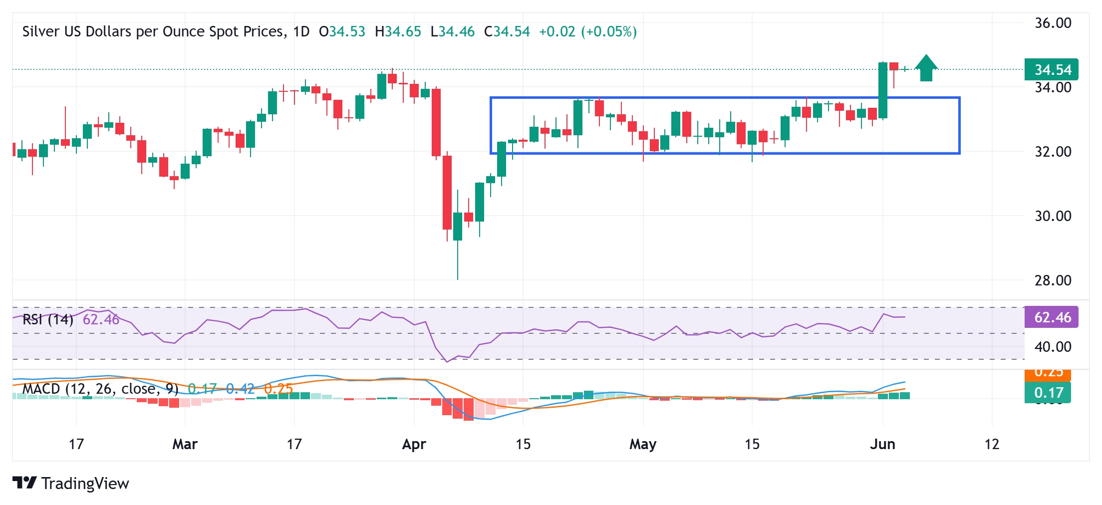 银价预测:白银/美元多头在接近34.00美元中位数附近占上风,略低于今年最高点。