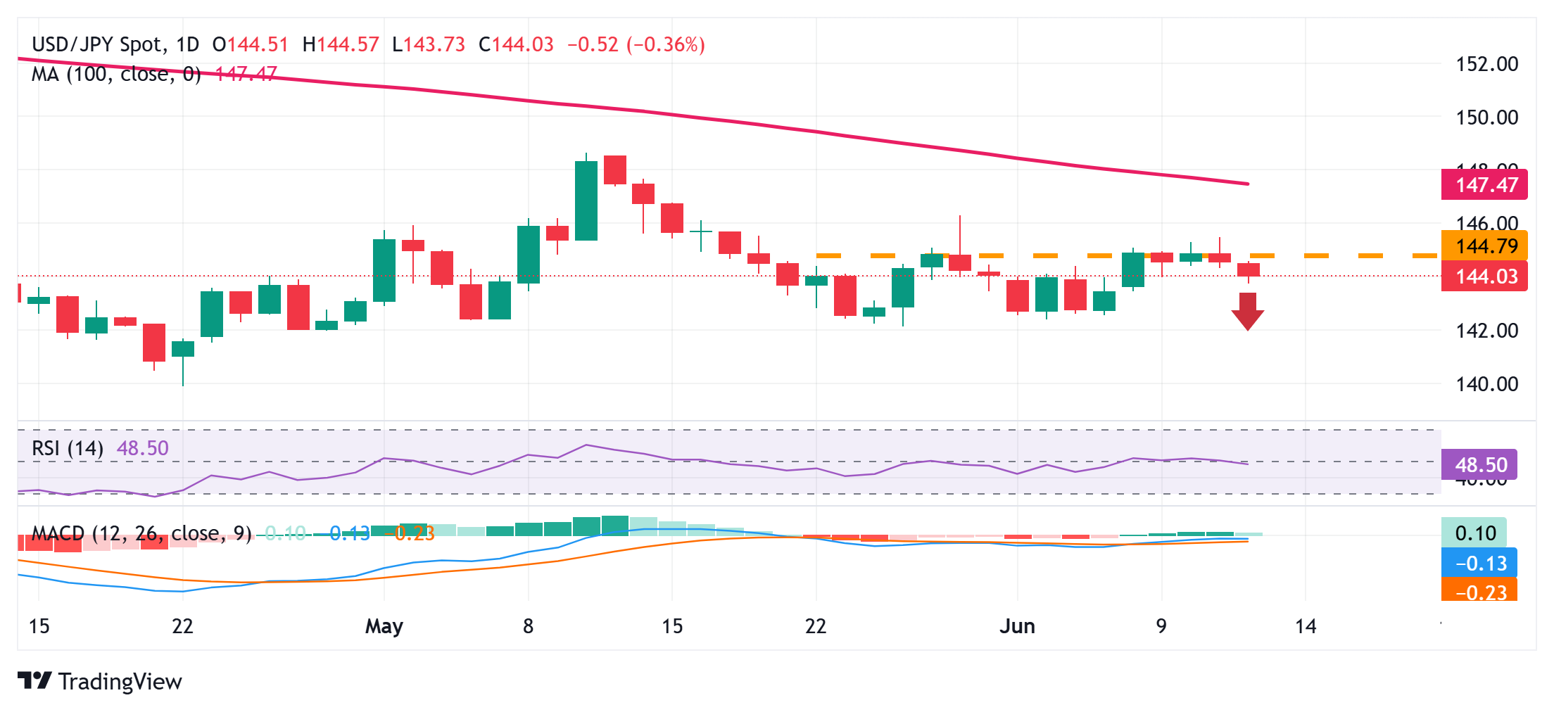 日元(JPY)在周四的亚洲交易时段内维持日内看涨偏见,同时美元(USD)持续走低,使得美元/日元(USD/JPY)对在144.00附近受到抑制,仅高于周低点。在美国总统唐纳德·特朗普威胁要实施新关税后,美国与中国高风险贸易谈判的积极消息引发的最初市场反应迅速消退。此外,中东地区地缘政治紧张局势加剧以及股市整体疲软,支撑了日元的避险地位。