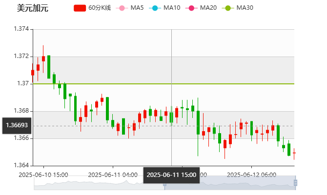 周四(6月12日)亚盘早盘,美元/加元最新价报1.3669,跌幅0.01%,开盘价为1.3671。国际油价持续攀升为加元注入强劲动能。
