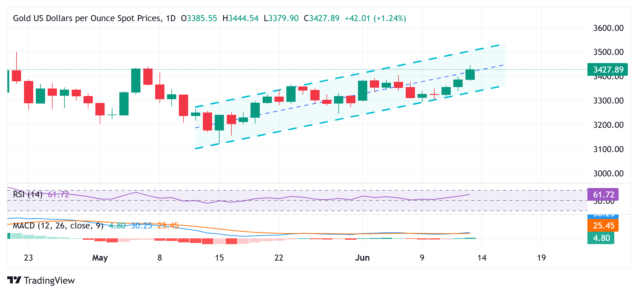 黄金价格 (XAU/USD) 从本周五早些时候触及的4月22日以来的最高水平略有退却,尽管在欧洲时段开始前仍保持在3400美元以上。在贸易相关的不确定性背景下,中东地区的地缘政治紧张局势进一步升级,抑制了投资者对风险资产的兴趣。这从全球股票市场的普遍下跌中显而易见,并成为安全避风港金条的助力。