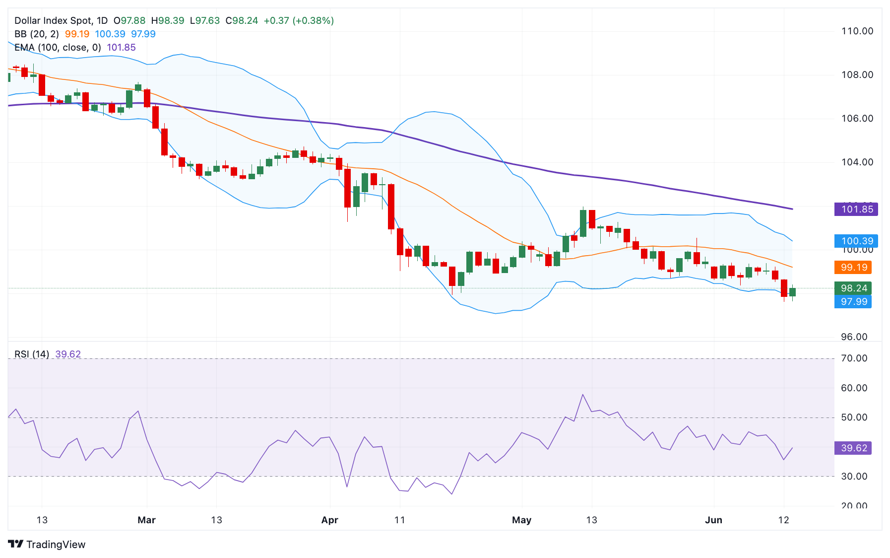 美元指数(DXY),以美元(USD)对六种世界货币的组合进行衡量,反弹至接近98.25的水平,在周五早些时候的欧洲交易时段结束了连续两天的下跌趋势。由于中东地缘政治紧张局势加剧,风险厌恶情绪对美元(USD)提供了广泛的支持。
