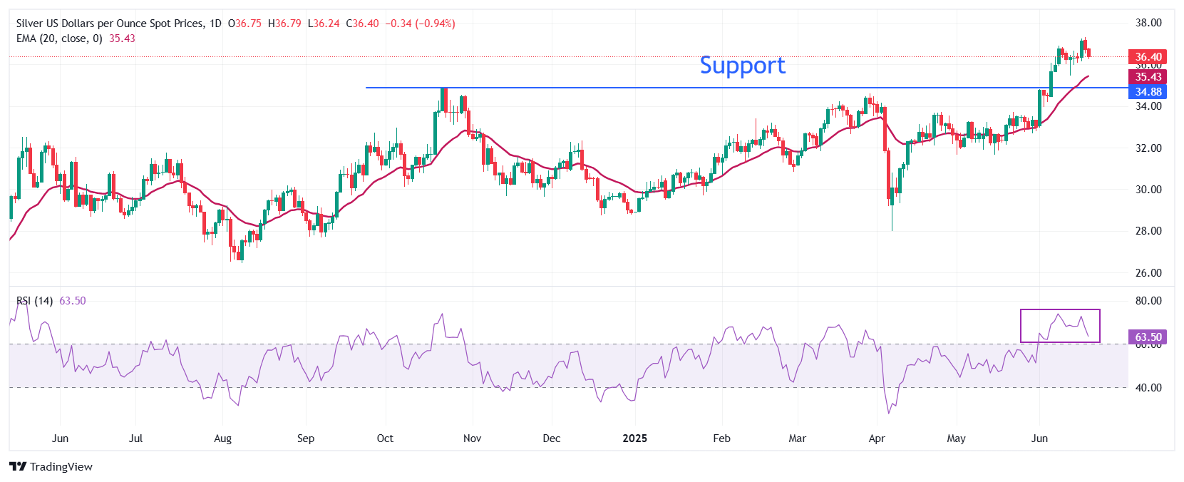 银价在接近37.32美元创下近10年新高后,难以进一步上涨。然而,由于白金属仍持有20日指数移动平均线(EMA),该平均线目前约为35.40美元,短期趋势仍看涨。