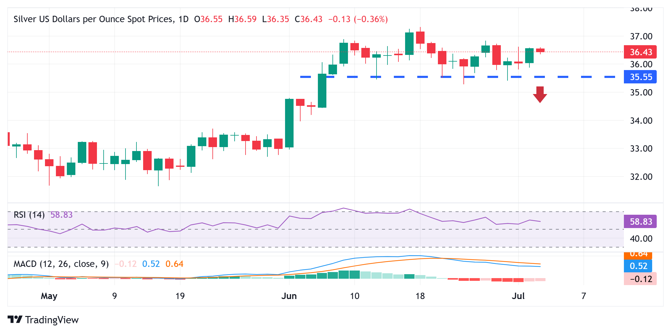 从技术角度而言,移动平均线收敛发散(MACD)柱状图和信号线在日线图上已经走低。然而,日线相对强弱指数(RSI,14)仍然高于50,这给XAG/USD空头带来了一些谨慎。因此,任何后续跌穿36.00美元的走势仍可能被视为买入机会,并且在35.50-35.40美元的水平支撑附近仍然有限。