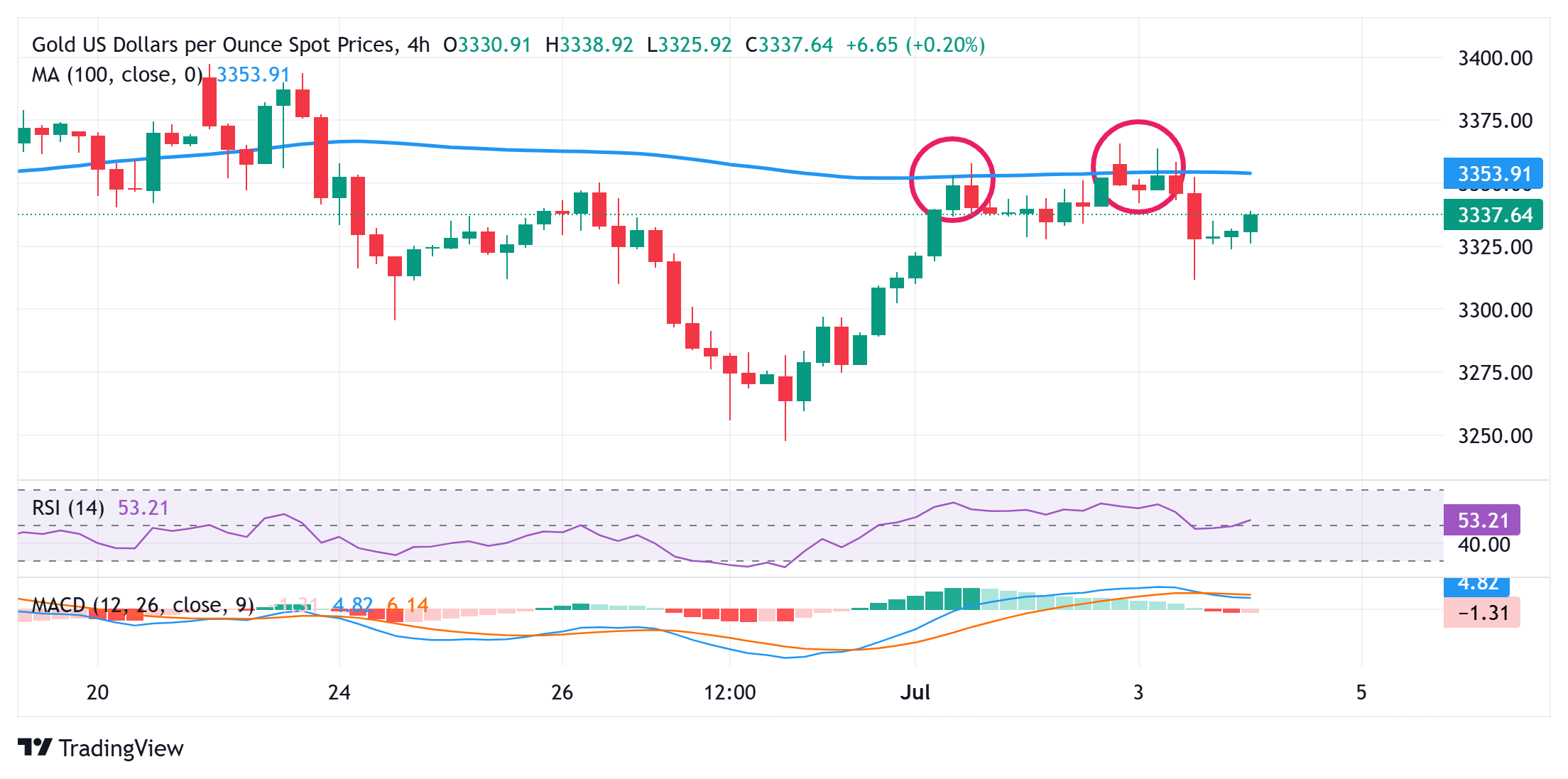 从技术层面上看,本周在4小时图表上多次尝试突破100期简单移动平均线(SMA)均告失败,这对XAU/USD的多头来说需要一些谨慎。所说的障碍目前位于3352-3355美元附近,并且应该作为一个关键的 pivotal 点。紧随其后的是夜间摆动高点,大约在3365-3366美元区域,只要突破这个区域,黄金价格就可能瞄准3400美元的整数位。