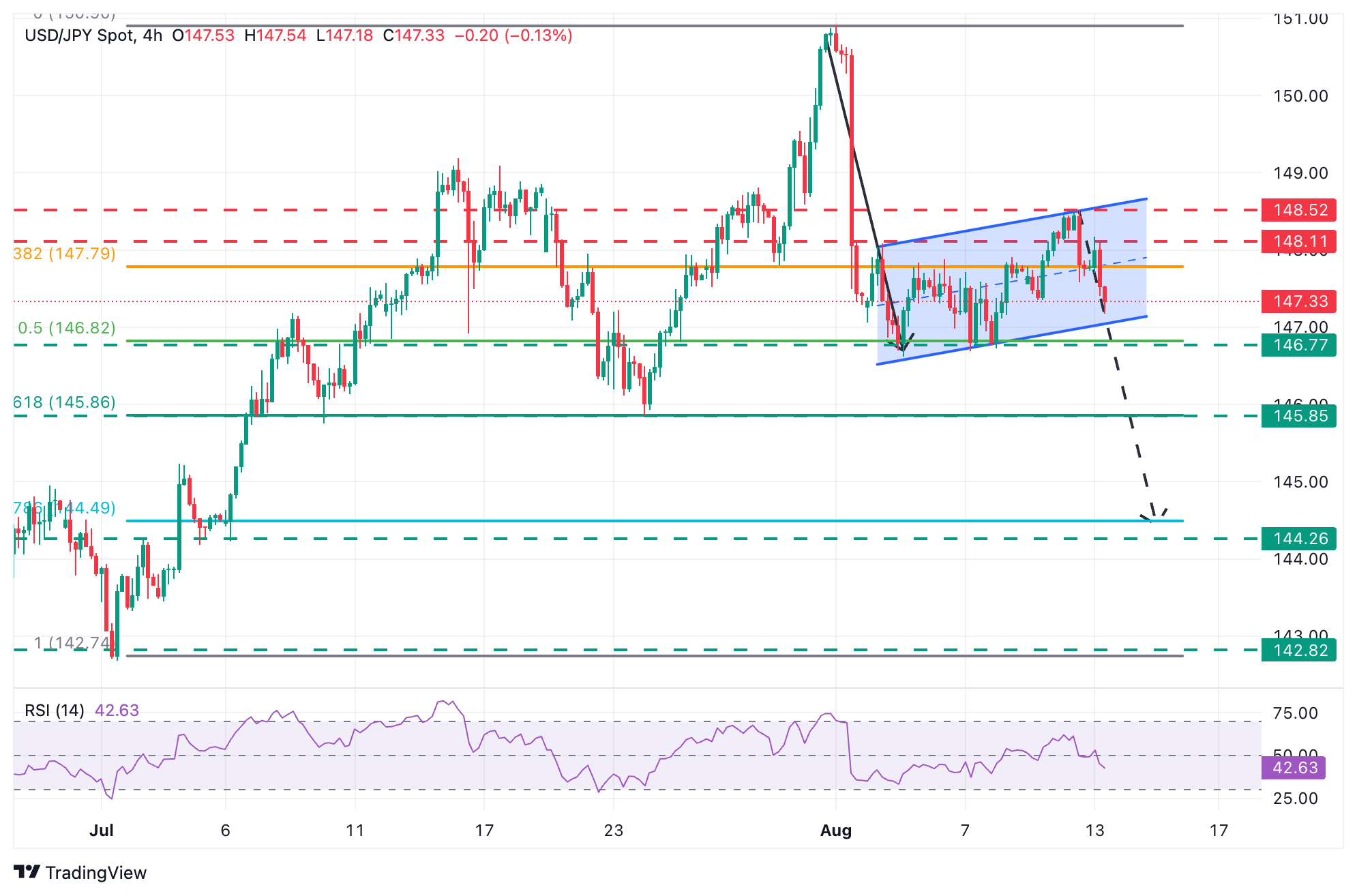 美元/日元可能在147.00下方启动一个熊市旗形形态。