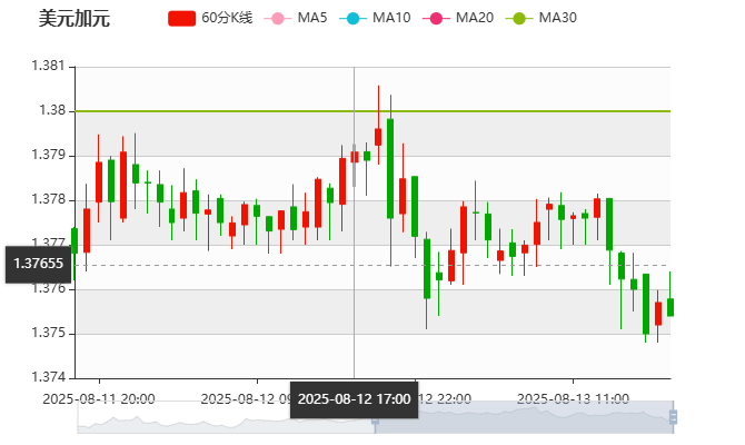 周三(8月13日)亚盘早盘,美元兑加元最新价报1.3775,涨幅0.03%,开盘价为1.3771。加元作为典型的大宗商品货币,近期走势与国际油价呈现高度联动。