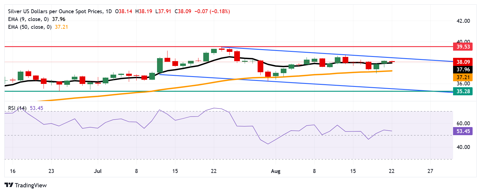 银 价格(XAG/USD)在两天上涨后下跌,在周五的欧洲时段,交易价格约为每盎司38.10美元。日线图的技术分析表明,贵金属的价格仍处于下降通道内,显示出空头趋势。