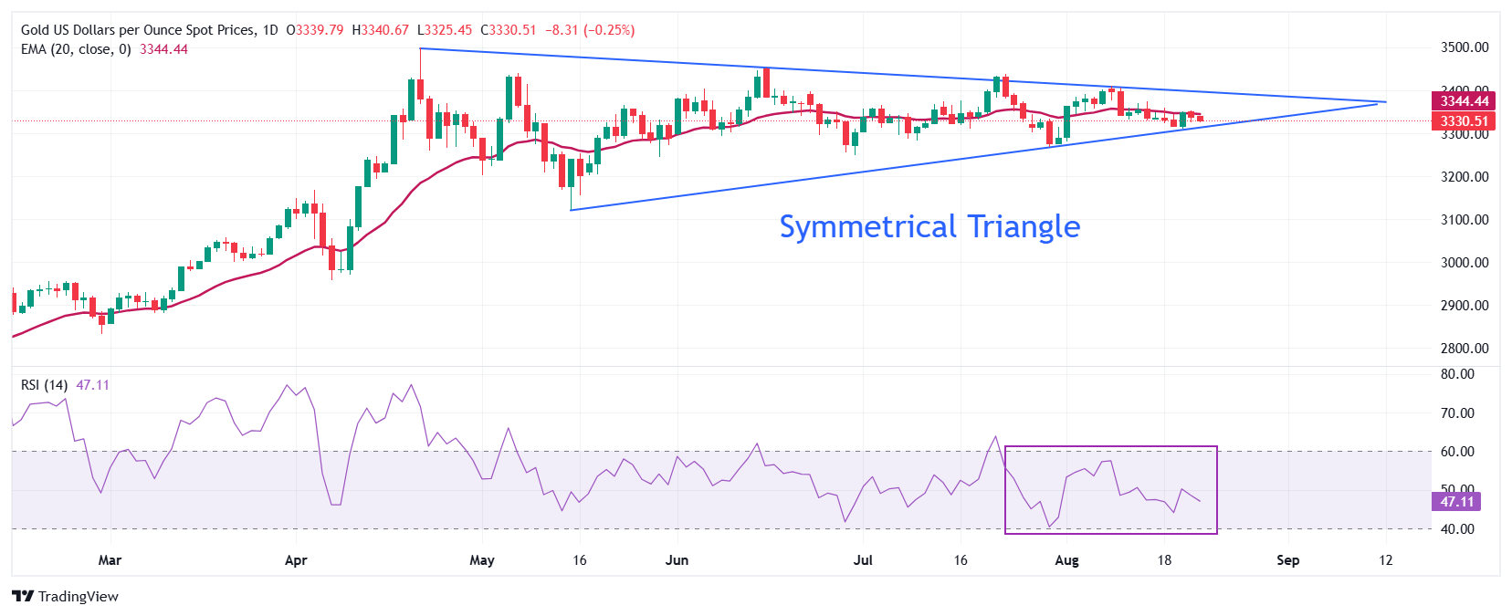 周五在欧洲交易时段,黄金价格(XAU/USD)在3,330.00美元附近下跌0.3%。贵金属面临抛售压力,市场专家认为联邦储备委员会(Fed)主席杰罗姆鲍威尔可能会在利率展望上重申他的“等待和观察”策略在当前环境下是适当的,并在杰克逊霍尔(JH)会议上于14:00 GMT发表讲话。