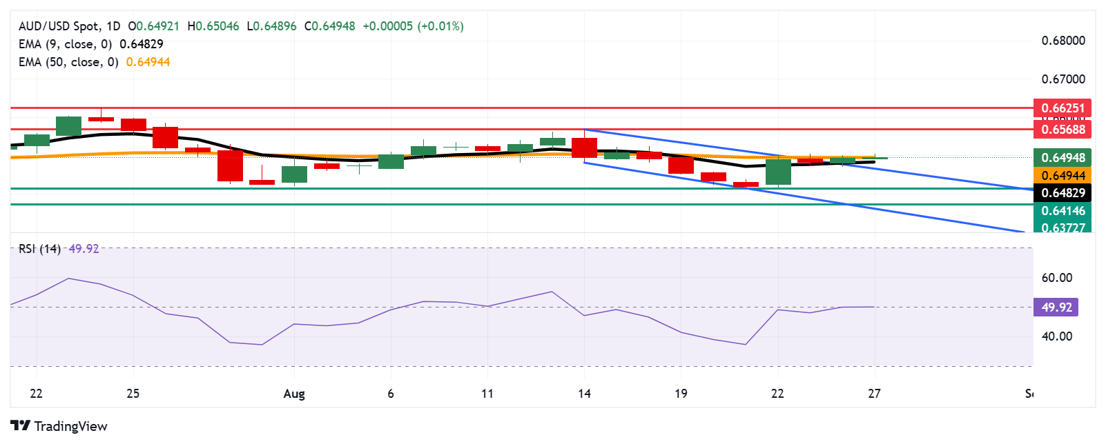 澳元/美元对在周三约为0.6500附近交易。日线图的技术分析表明,该对略高于下降通道形态,显示出看涨情绪的出现。此外,该对上方有九日EMA,表明短期价格动量正在增强。