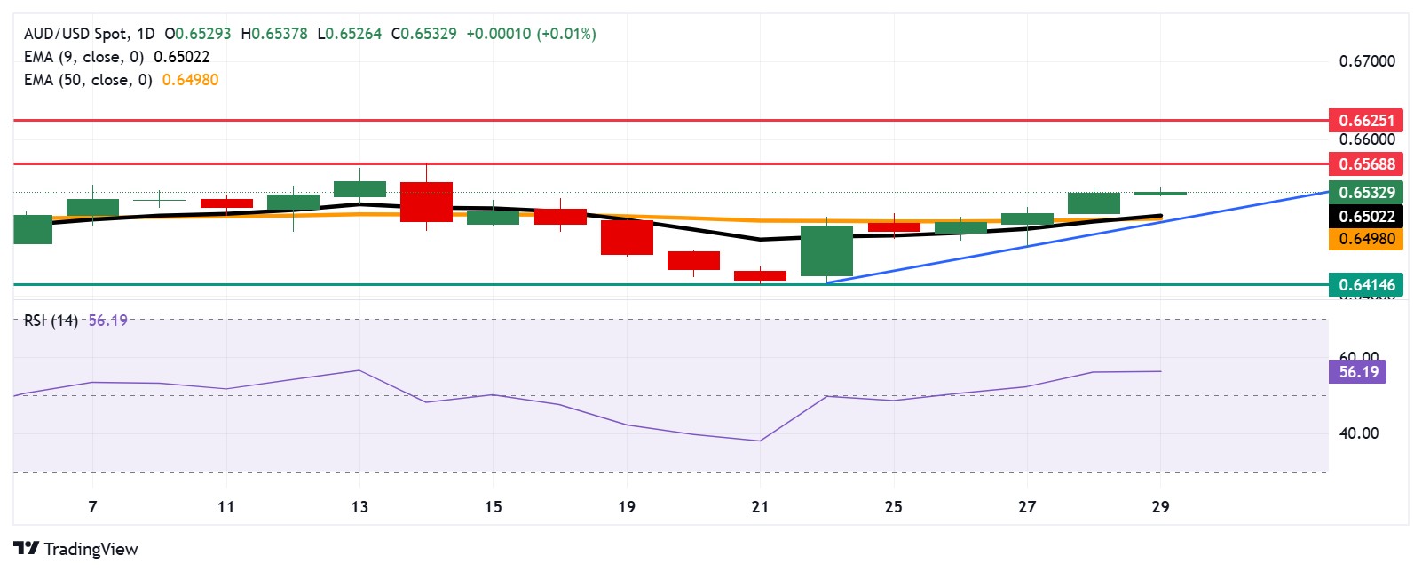 周五,澳元兑美元交易价格约为0.6540。日线图的技术分析表明,该货币对略高于上升趋势线,显示出主导的看涨趋势。此外,该货币对上方有九日指数移动平均线(EMA),表明短期价格动量强劲。