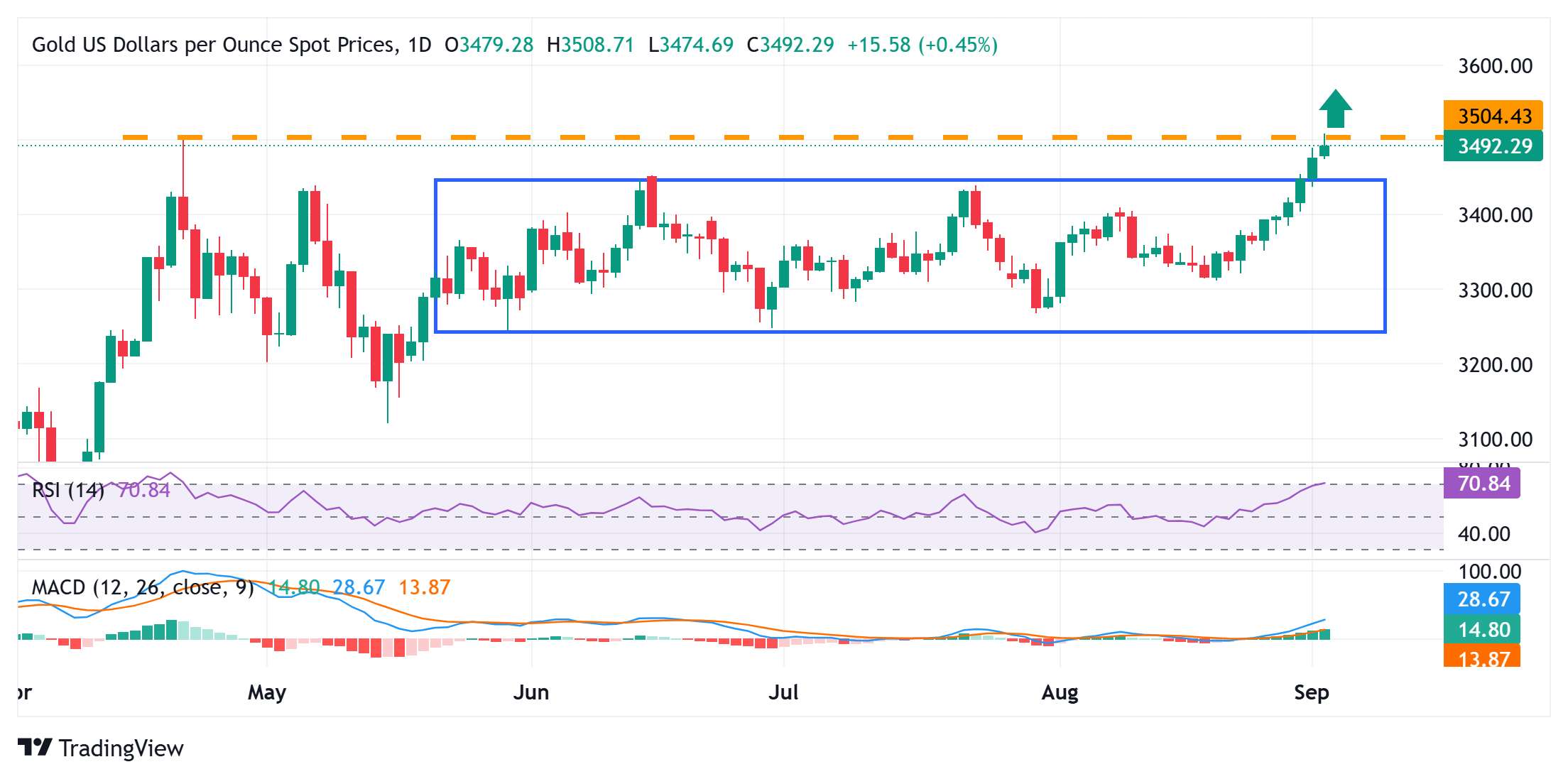 不断上升的联邦储备系统降息预期推动黄金价格连续第六天上涨,达到3500美元的心理价位之上或亚洲时段的新历史新高。