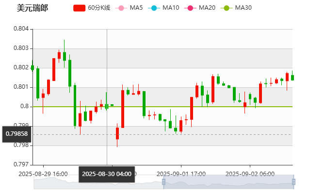 周一(9月2日)美元兑瑞郎汇率今日开盘报0.8000,昨日收盘于0.8000,截至发稿前美元/瑞郎报0.8012,涨幅0.15%,最高价0.8016,最低价0.7999。周四将公布瑞士8月消费者价格指数(CPI)数据,市场普遍预期年率将为0.2%,与7月持平。