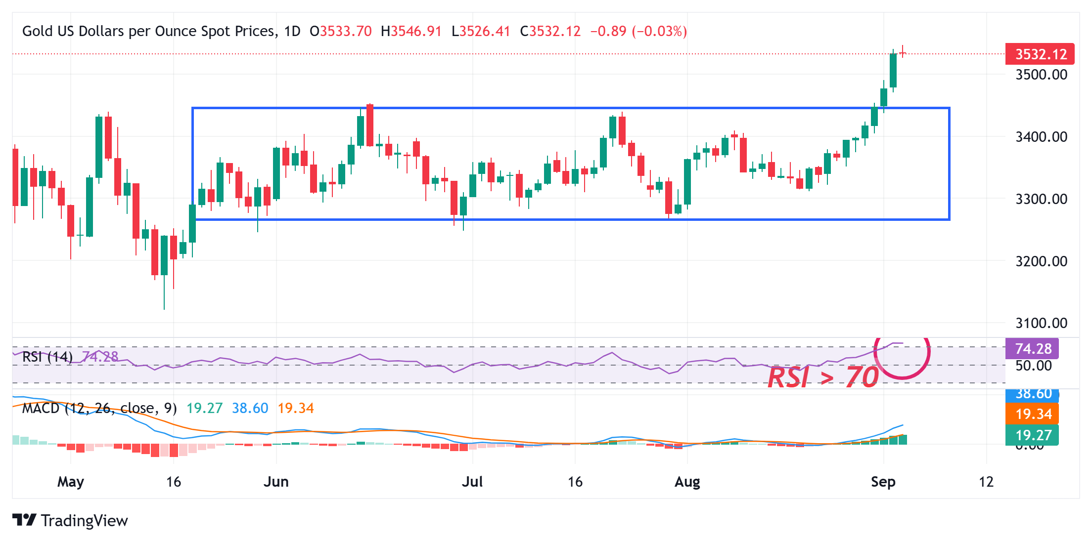 从技术层面上看,突破3500美元的心理预期验证了上周突破三个月交易区间的有效性,并支持了进一步上涨的论点。然而,日相对强弱指数(RSI)显示市场过热,因此在下一次上涨之前,谨慎等待一些整理或温和调整是明智的。