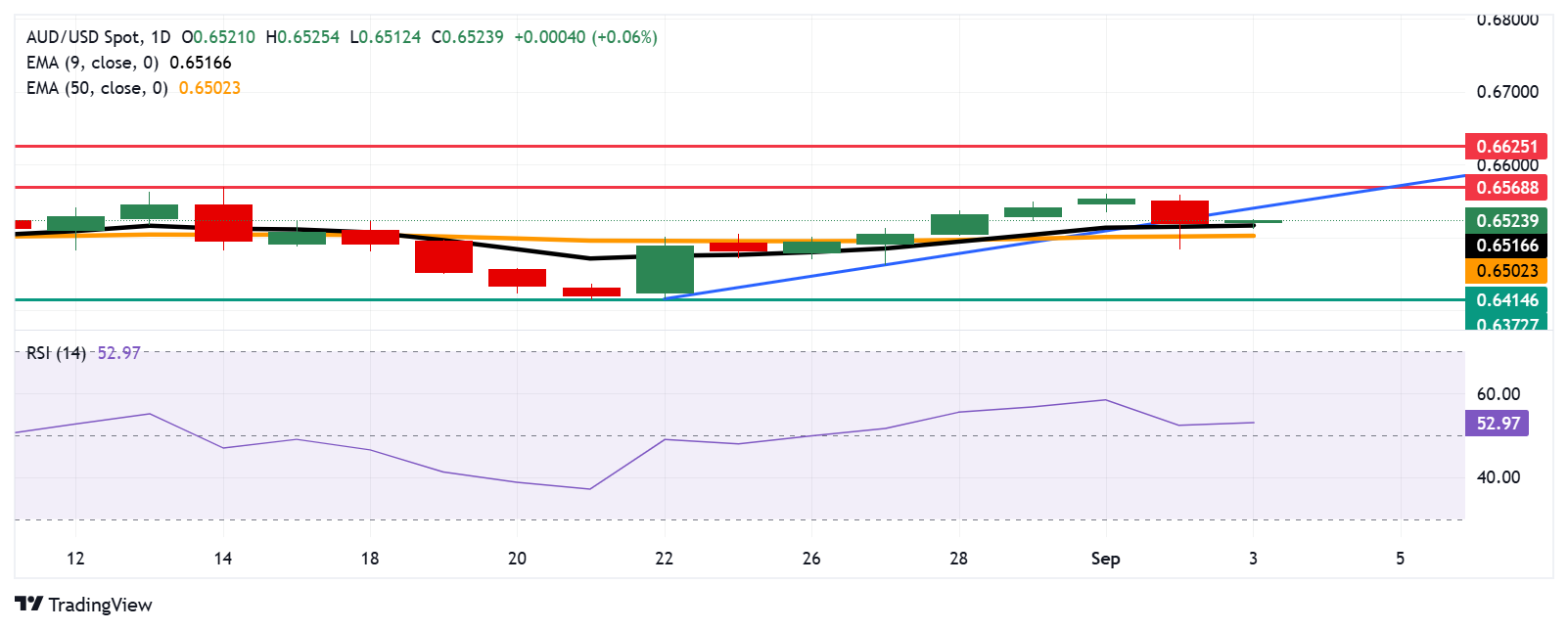 澳元兑美元对在周三交易于0.6520附近。日线图的技术分析显示,该货币对已跌破上升趋势线,这表明可能从看涨转变为看跌。然而,该货币对仍然位于九日指数移动平均线(EMA)之上,表明短期价格动量更强。如果该货币对突破这一水平,将表明看跌确认。