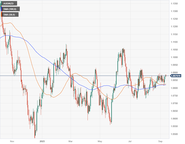 2023 年 5 月下旬接近 1.0575 的底部仍然完好无损,6 月的峰值 1.0150 仍然遥不可及,因为澳大利亚交叉货币对难以突破横盘整理,在 1.0850 水平附近盘整。